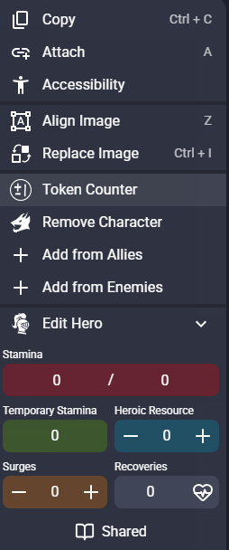 Selecting Add Hero allows users to track stamina, temporary stamina, heroic resources, surges and recoveries, as well as toggle their health as visible to the director only or to everyone.